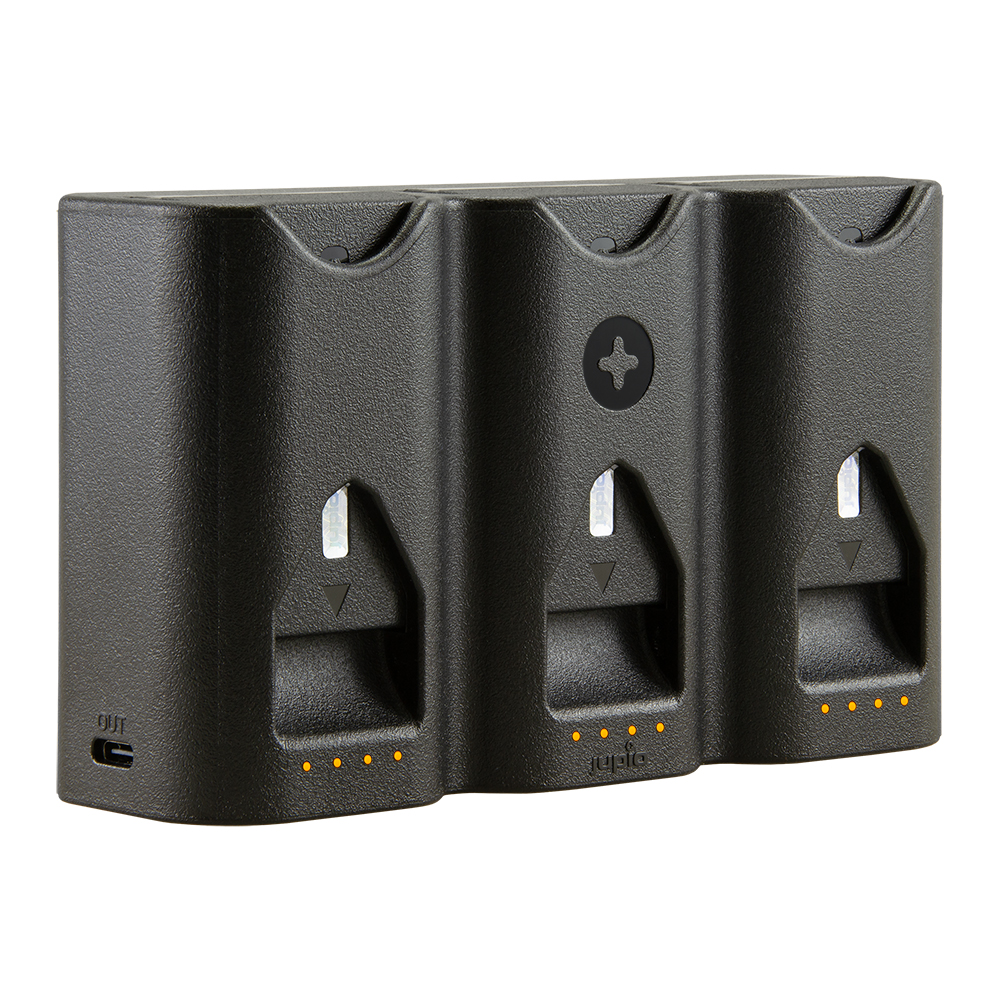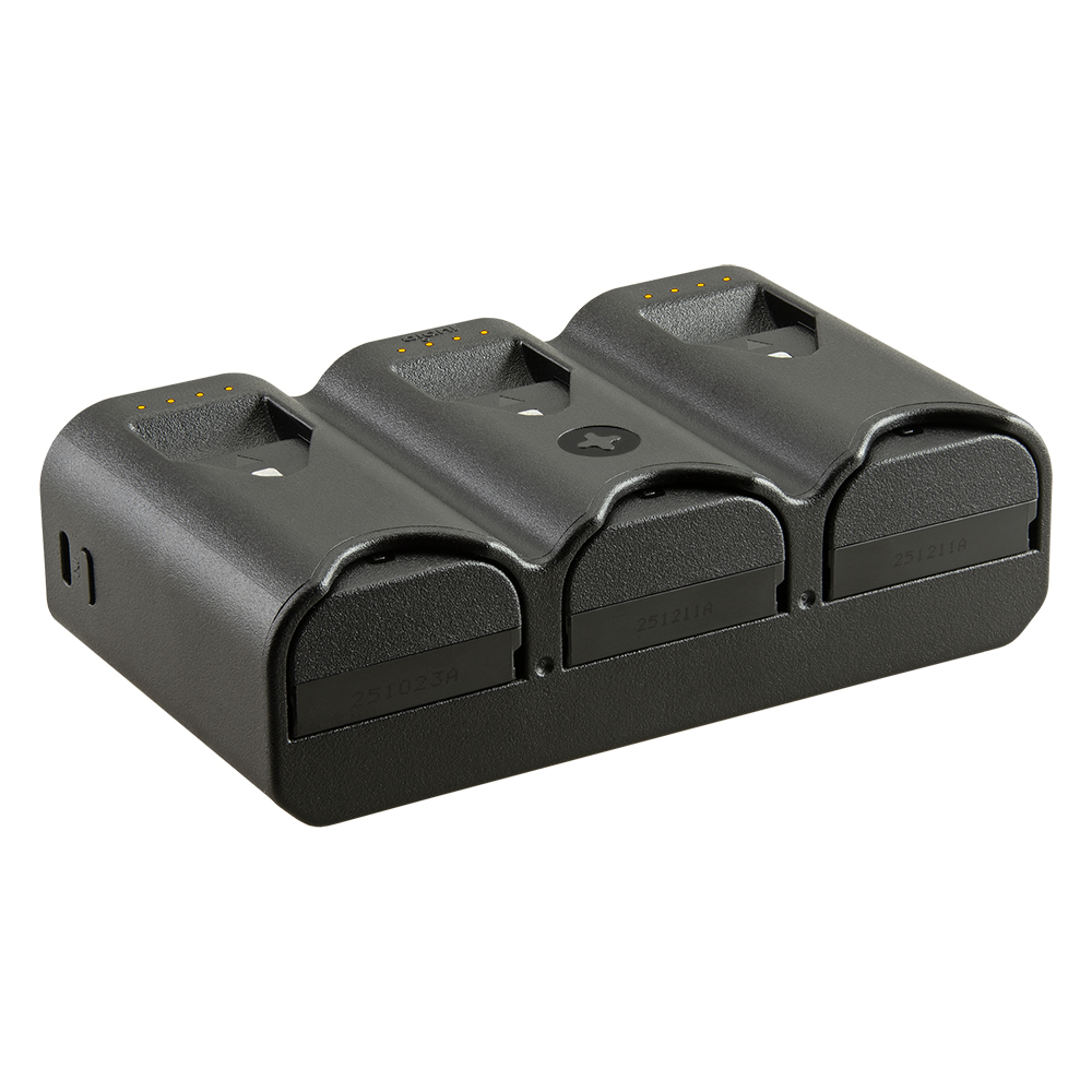 Met behulp van de USB-C ingang kunnen drie accu’s gelijktijdig worden opgeladen. Iedere sleuf is uitgerust met vier afzonderlijke LED-indicatoren, waarmee de laadstatus per accu duidelijk en overzichtelijk wordt weergegeven. Dankzij de aanwezigheid van een statusknop blijft deze informatie ook buiten laadmomenten raadpleegbaar.